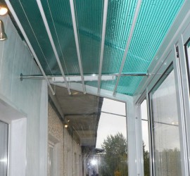 - Сотовый поликарбонат используют для прозрачных крыш. Он стойко переносит агрессивное воздействие среды, ослабляет шум, блокирует инфракрасные лучи. Полупрозрачный материал впускает больше света на балкон. Он не настолько прочный, как металлический профлист. Если планируется утепление крыши и дополнительная шумоизоляция, то поликарбонат не подойдет.